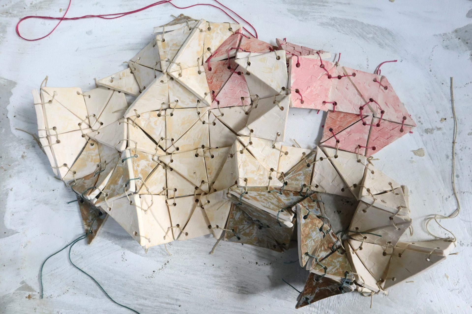 Iori was experimenting with her slab work by making impressions of textile patterns on the flattened clay and selecting light colored glazes. She finds a suitable shape in the triangle, punching holes on the corners to help tie the pieces together and exploring new shapes like a puzzle.