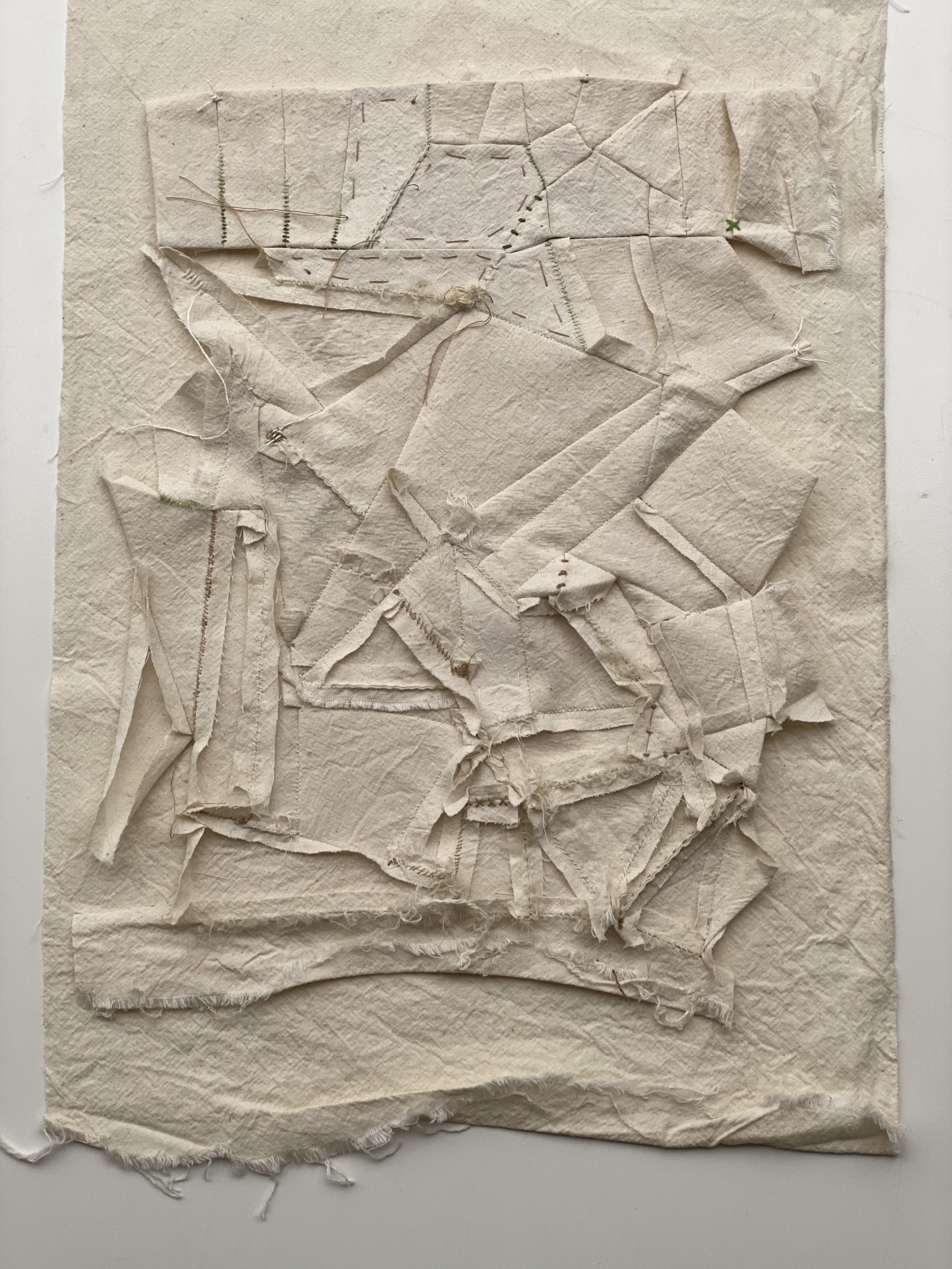 She also saw her work as a maze, something that she has to find her way out of. While Iori was working on clay, she decided to work with cotton fabric. Initially working with earthy colors for the fabric and thread, she incorporated green thread in the latter part of the process “following growth and regrowth.” She noticed, with some amusement, that it was starting to look like a familiar landscape: an English countryside with its patchwork fields and pastures.