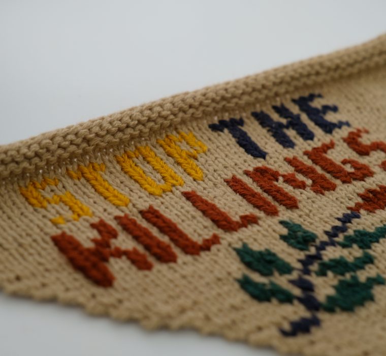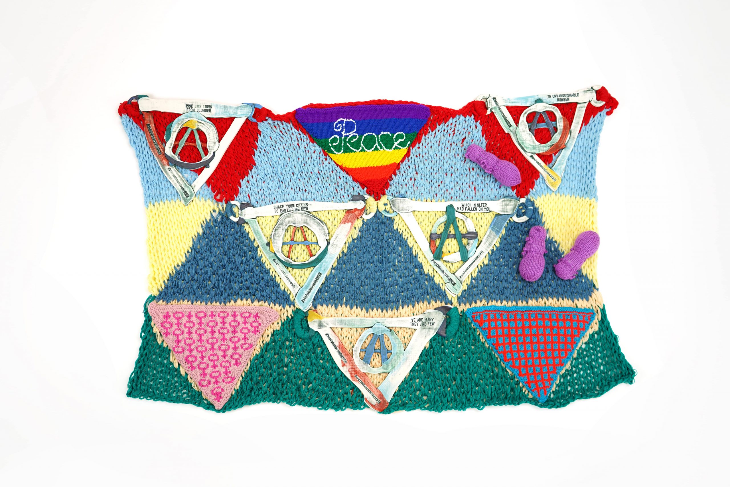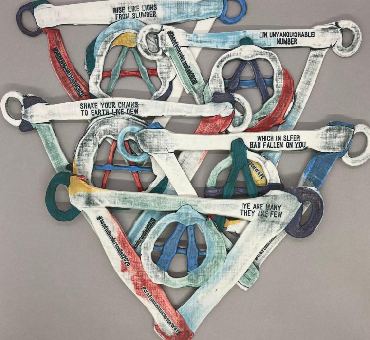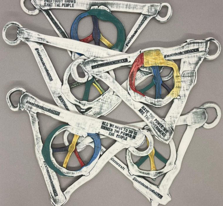 Candy and Linzi take inspiration from the 19th century English Romantic poet Percy Bysshe Shelley’s “The Masque of Anarchy,” and bring together symbols of resistance and solidarity throughout history and across the world into a shared work. Made of colorful and vibrant ceramic and knitted pieces, their work is inscribed and imprinted with words that still ring true across time and space: chains can be broken, there is strength in numbers, and a better world awaits.